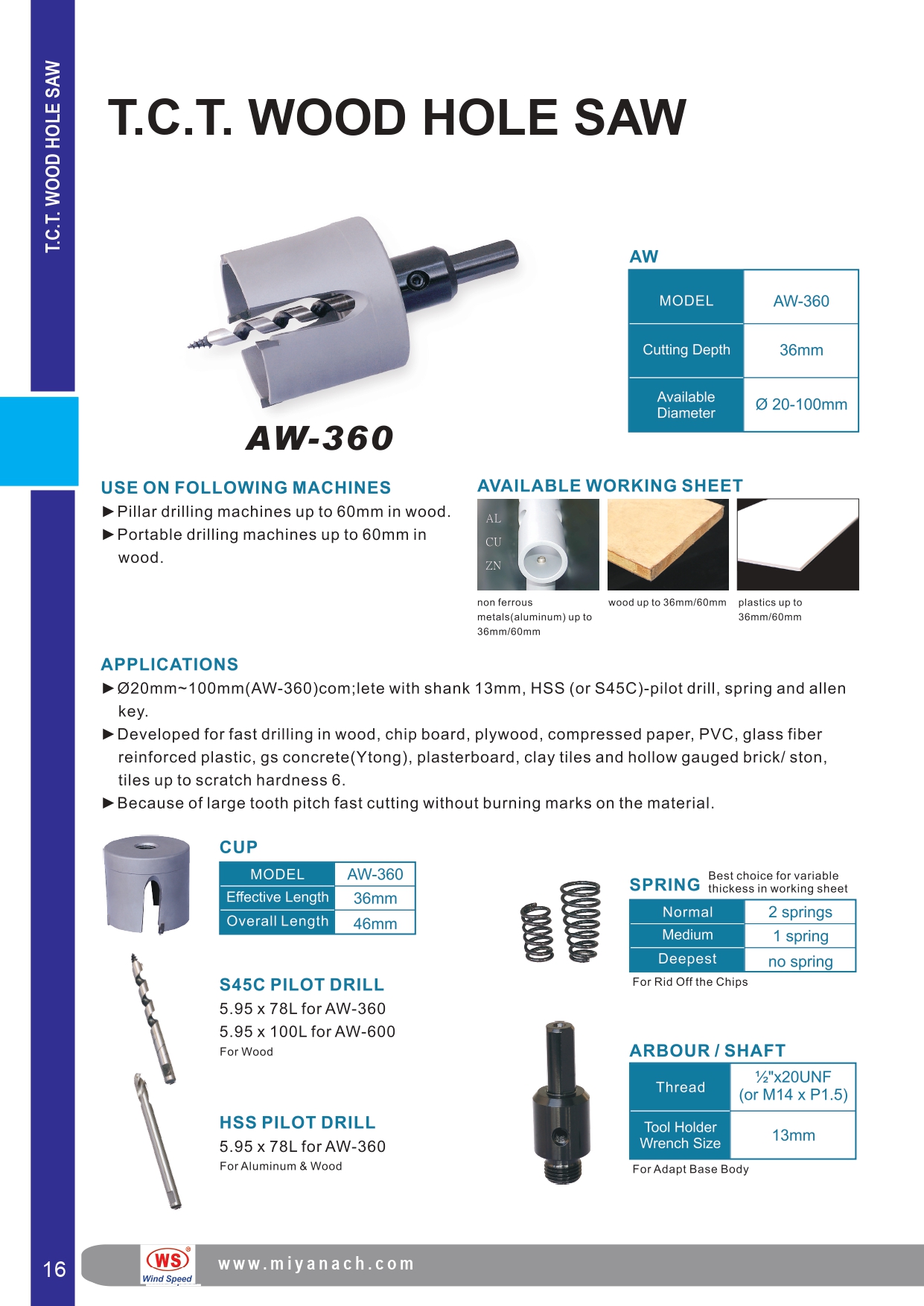 A standard model (1-PLY) TCT hole saw product. It has shank arbor and saw cup seperated. It is designed for drilling on 36 mm thickness aluminum sheet, wood sheet, plastic sheet and sizing from 20 mm to 100 mm in diameter. Because of its special wide and deep slot design, AW-360 is able to get rid of chips easily.