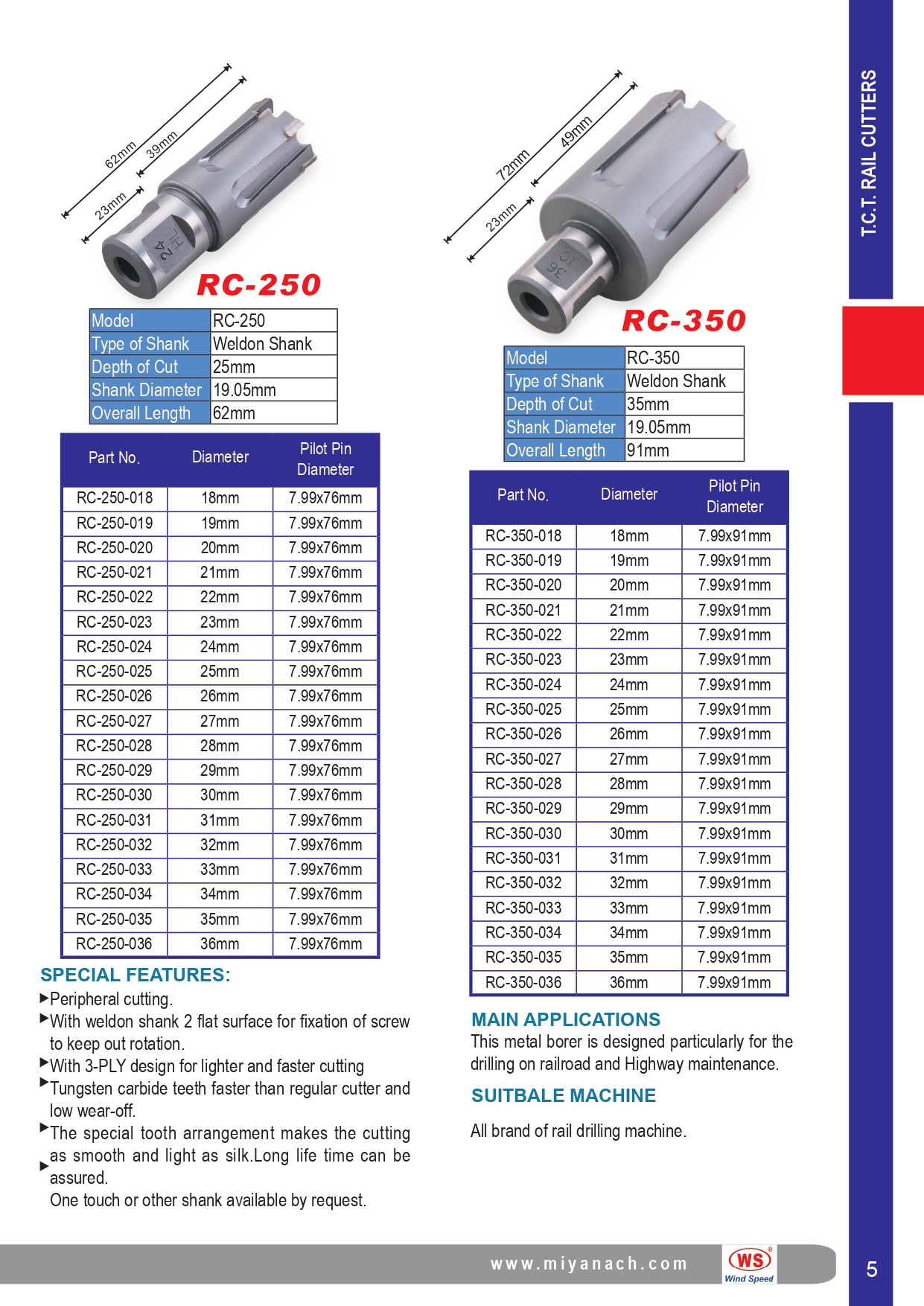 A 3-PLY TCT annular cutter product. It's peripheral cutting and having fast, smooth, light cutting due to its special tooth arrangement. With excellent ability to get rid of chips, RC series is perfect for rail drilling. It has Weldon shank 2 flat surface that can be connected to all brand of rail drilling machine.