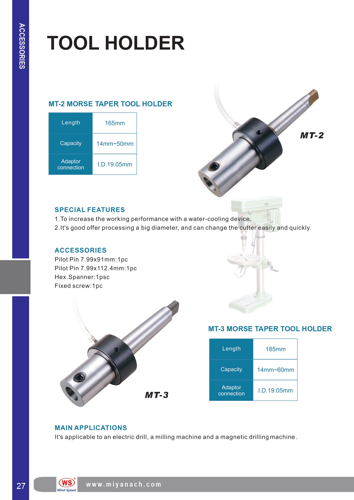 可以在工具機(WS-6025MT)上轉接直徑19.05毫米的柄的穴鑽,同時也是冷卻裝置,可以透過降溫來增加切削效率。MT-2支援尺寸為直徑14mm到50mm的穴鑽。