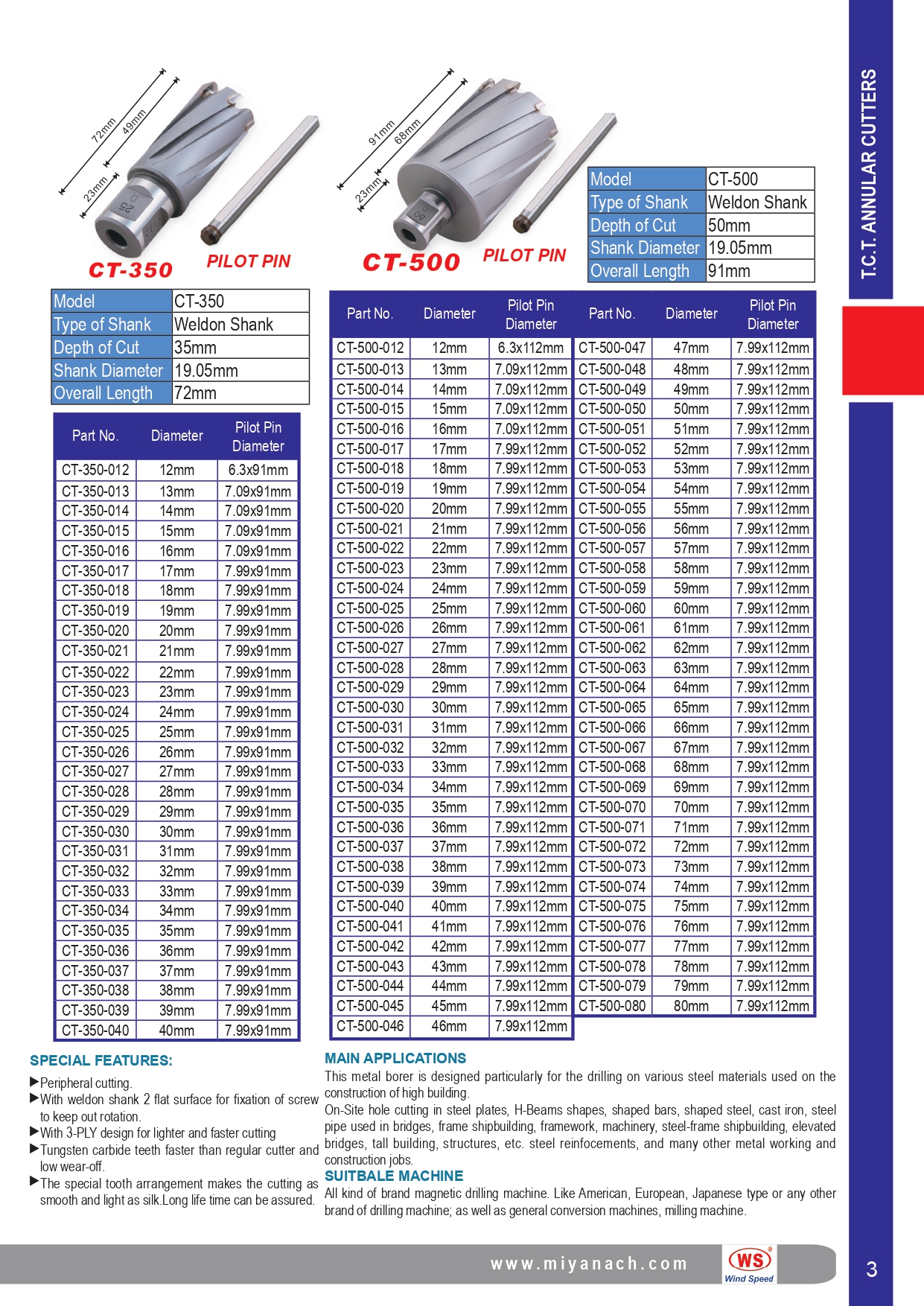 三刃式穴鑽,採用邊緣切削。特殊的鎢鋼刀刃設計,讓CT系列產品能夠既快速又柔順的進行切削。 CT系列採用兩面式 Weldon 柄心軸設計。標準尺寸柄心軸讓CT系列產品能用在各大品牌的磁吸式鑽孔機、轉換機以及銑床。